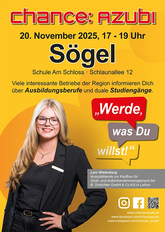 Du bist auf der Suche nach deiner Traum-Ausbildung oder willst dich einfach inspirieren lassen? Dann schnupper doch mal bei der Ausbildungsmesse „Chance: Azubi“ rein! Dieses Jahr findet die Messe am 20. November 2025 von 17:00 bis 19:00 Uhr in der Pausenhalle der Schule am Schloss in Sögel statt.
